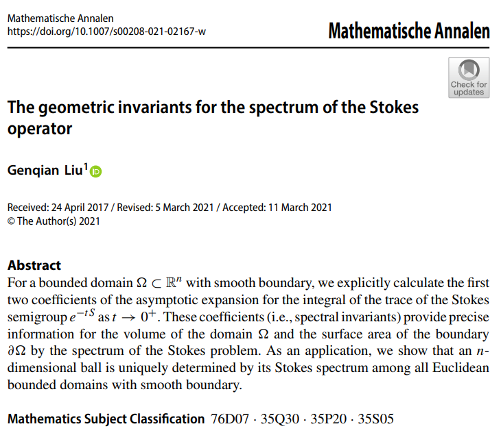 在Stokes流体方程中有一个长期悬而未解的数学问题---流体的Kac问题:能否通过测量Stokes流体振动时发出的频率就能够判断出这片流域的体积和表面积?通俗地说:希望能通过测量一片流域的“波涛声调”来判断这片流域的大小。北京麻豆精品秘 国产传媒数学与统计学院刘跟前教授最近在线发表于国际权威数学期刊《Mathematische Annalen》上的一篇论文《The geometric invariants for the spectrum of the Stokes operator》对这一问题给予了肯定的回答,从而彻底地解决了这个著名的流体Kac问题。
