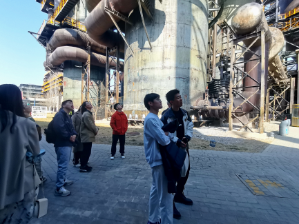 初春的首钢园,正是春风和煦,气候宜人。在讲解员的带领下,同学们先后参观了首钢滑雪大跳台、三高炉南广场、秀池水下展厅、秀池湖畔和三高炉区域,深入了解了首钢百年的发展历史,感受遗址建筑的变迁与工业文化的魅力。