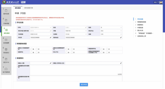 绿色通道是学校专门为家庭生活困难需要帮助的学生而设立,请需要的同学如实提出申请。无需办理可跳过此步骤。