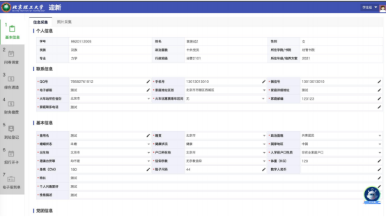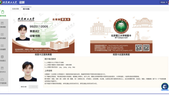 基本信息中,需要进行信息采集和照片上传(照片为白底寸照),信息项较多,建议填写一部分后暂存,以免丢失所填信息。上传的照片将显示在校园卡上。
