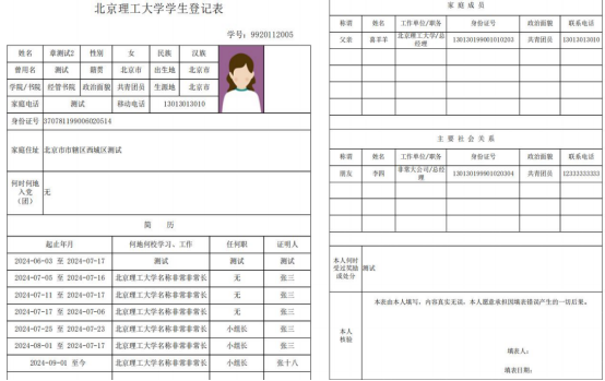 以上内容全部填写完成后,将会生成电子报道单,点击最下方“打印报到单”,在线生成入校报到单,请核验信息是否正确。到校前,请自行打印的报到单,到校后上交。